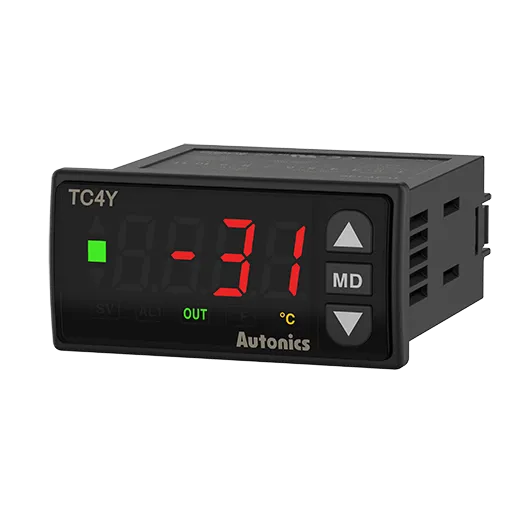 Autonics TC4Y temperature controller, 72x36mm panel mount. Accepts PT100, K-type, or J-type inputs. Relay output, 100-240VAC supply.