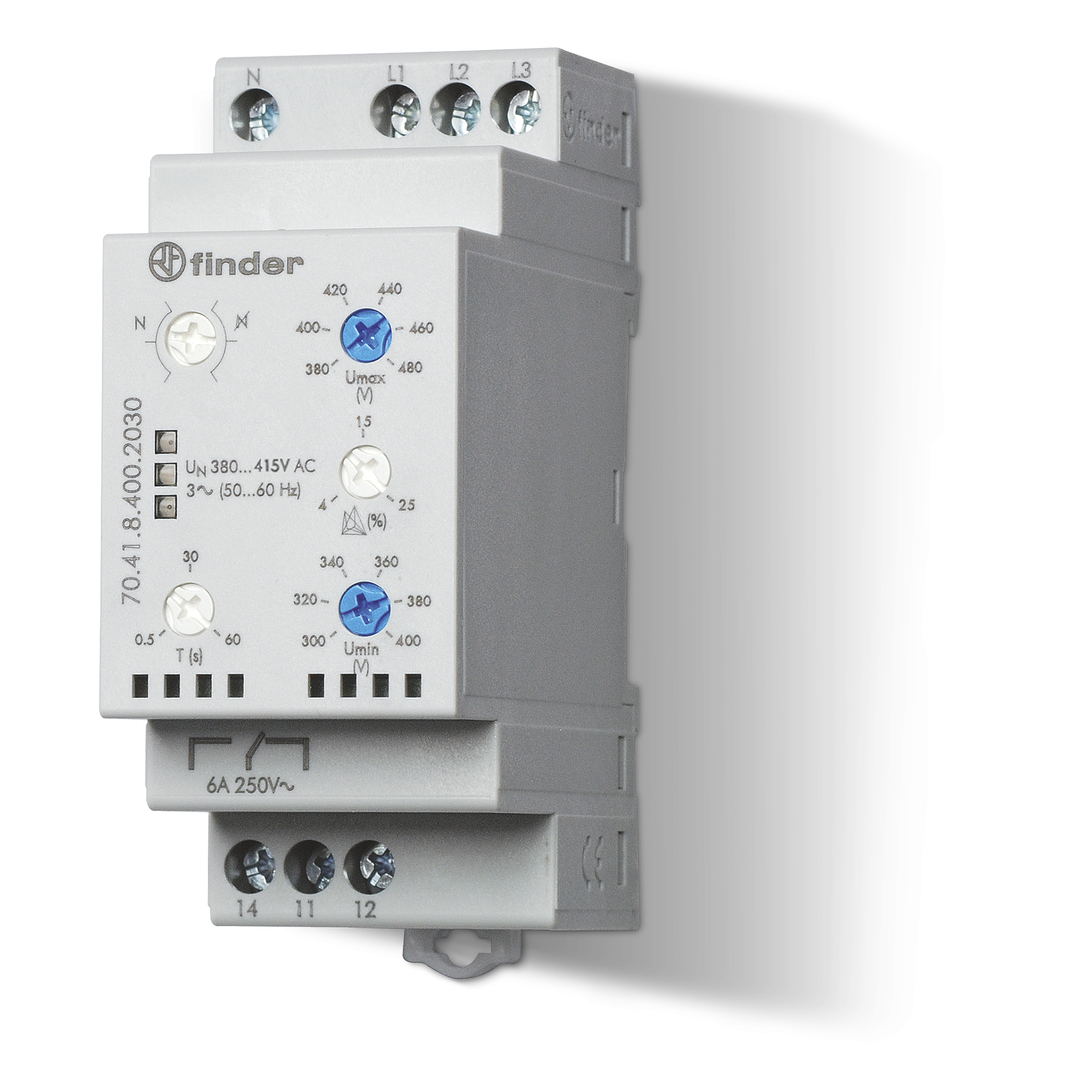 Finder PHASE LOSS-ROTATION-ASYMMETRY-OVER+UNDER VOLT RELAY 3PH3W/4W, 380-415VAC, SPDT