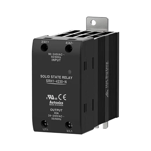 Autonics SRH1 series single-phase solid state relay with integrated heatsink for DIN rail mounting. Zero-cross switching, LED indicator. Compact DIN rail design eliminates the need for separate heatsinks.