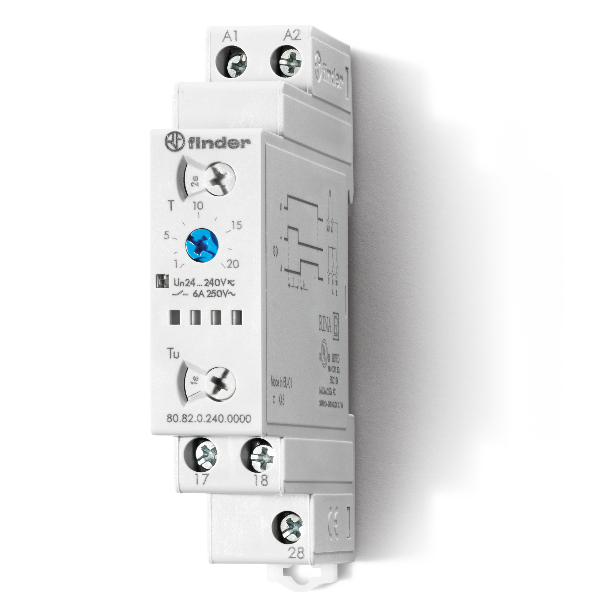 Modular timers, Mono-function, 2 NO, 6 A, AC/DC coil, 240 V, operating from 16.8 to 265 V (AC)/(DC), rated power 1.3 VA (AC) / 0.8 W (DC), ambient temperature from -20 to +60 °C