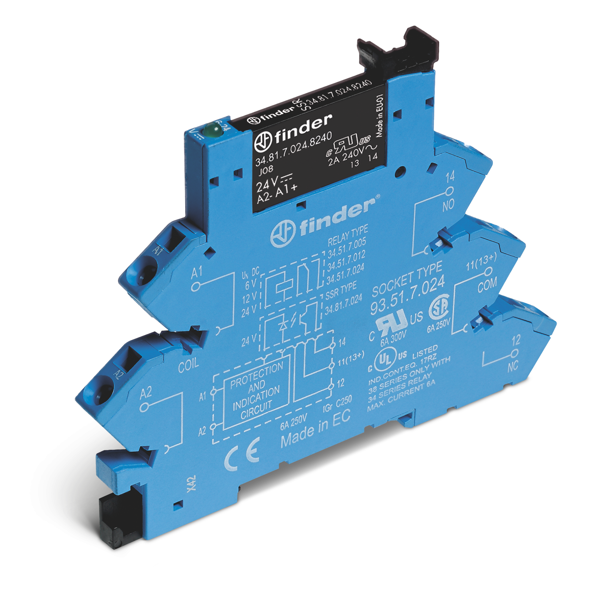 Finder Type 38.91 SSR RELAY MODULE, OUTPUT 6A@24VDC, 24VDC CONTROL, SPRING CLAMP