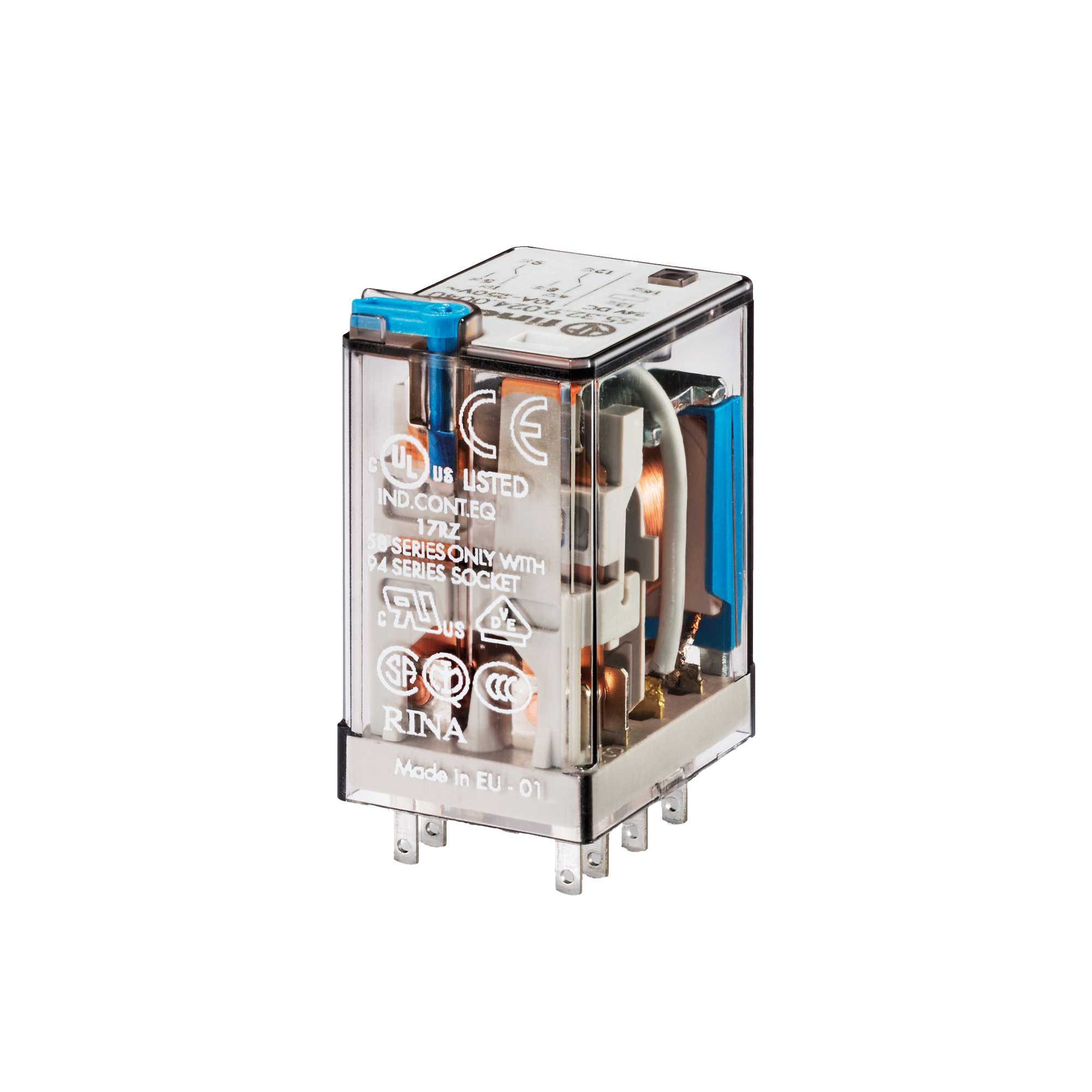 – General purpose plug-in relays. 2 CO 10 A. For use with 94 Series sockets. AC or DC coil. Lockable test button option and mechanical indicator as standard. Variant with LED and integrated protection circuit.