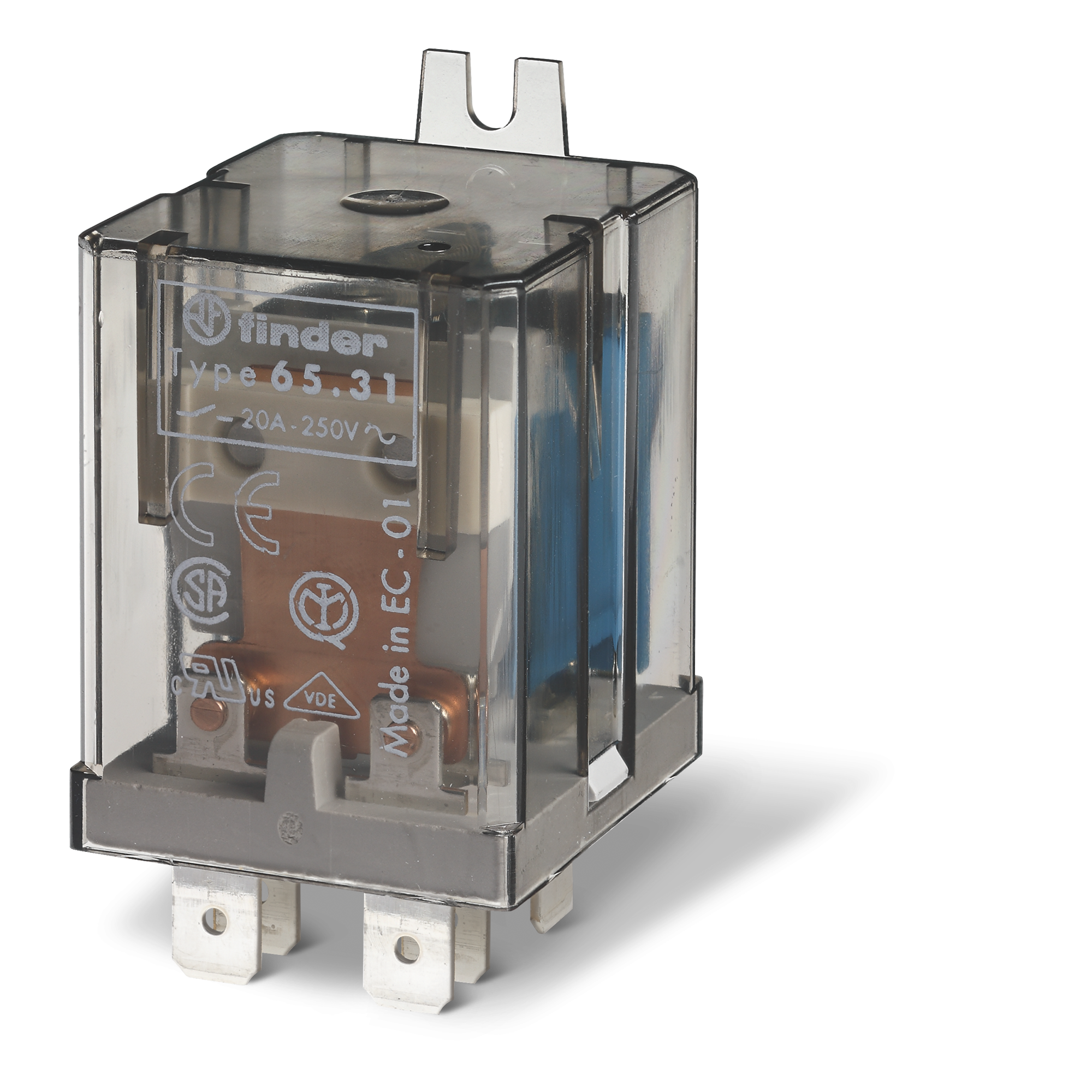 – “Power relay with mounting lugs on the back and Faston 250 connections Versions available: Type 65.31: 20 A 1 NO + 1 NC Type 65.31-4300: 30 A 1 NO”.