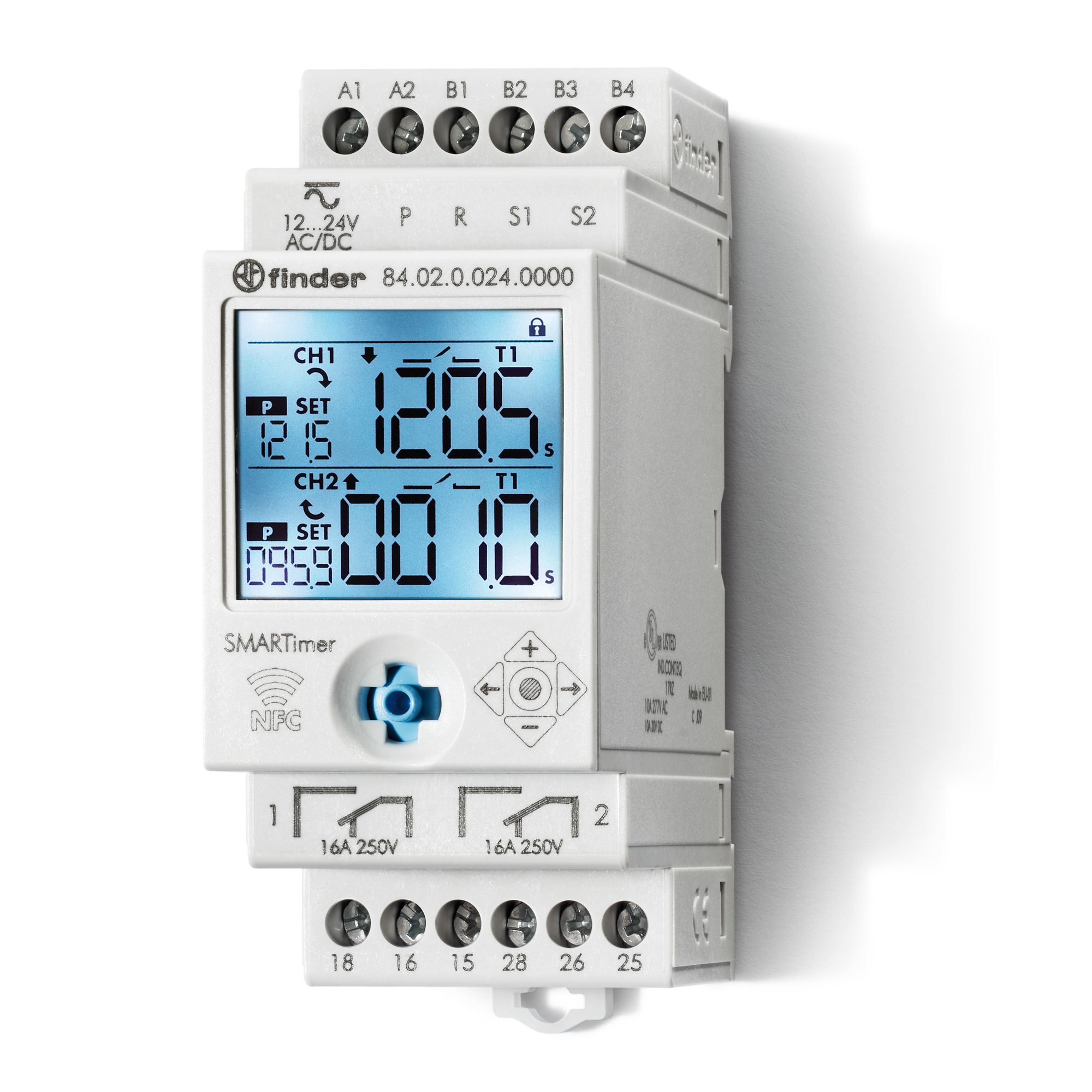 Finder Type 84.02 DIGITAL MULTIFUNCTION TIMER, NFC, 12-24VAC/DC. 2 INDEPENDENT CHANNELS